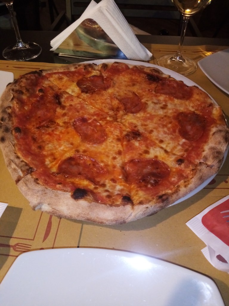 Now you’re probably assuming that the chicken wings kicked things off, but you’d be wrong. Why? Firstly, I was eating out with my parents (who retired to Italy in 2011) so it was a shared pizza. Second, as chickens aren’t taken to meet their maker when they’ve barely started growing feathers, like they are in Britain, they’re left to grow a bit bigger and so there’s more meat on the wings. Makes sense, doesn’t it. Anyway, on to the wings in a bit, as the cheesey platter of perfection had arrived. We’d ordered a 12″ Diavola, where nice n’ spicy but never too much is the order of the day. There’s only one topping that could strike this delicate balance with its eyes closed, and that’s ‘nduja, which is found in this part of the world in abundance. Its hometown of Spilinga is but 11km away – no travelling required here.